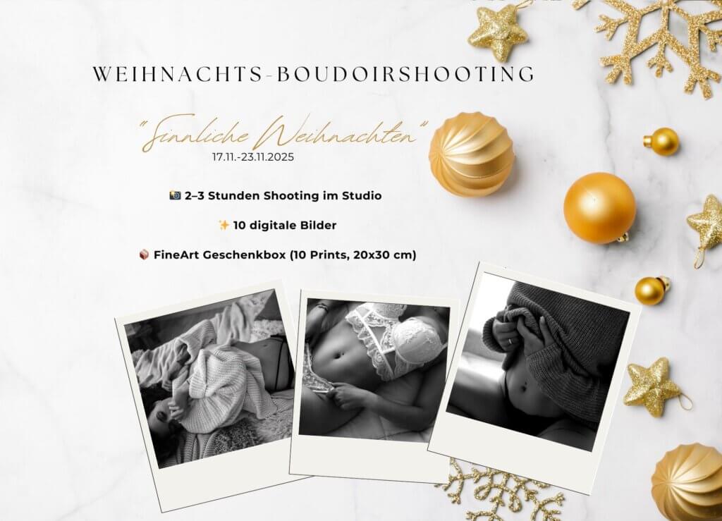 Warum? Damit ich dir garantieren kann, dass deine Bilder und Produkte rechtzeitig vor Weihnachten fertig sind und weil Exklusivität dazugehört. Außerhalb dieser Wochen gelten wieder meine regulären Boudoir-Angebote.